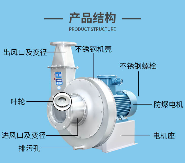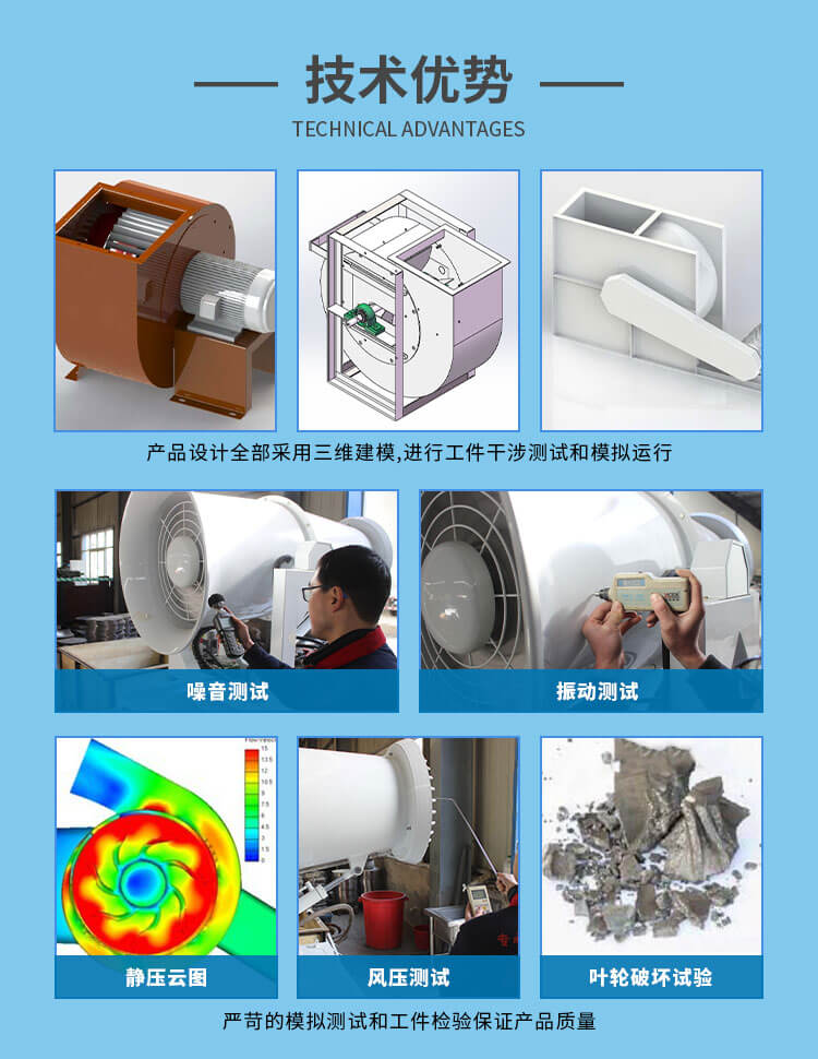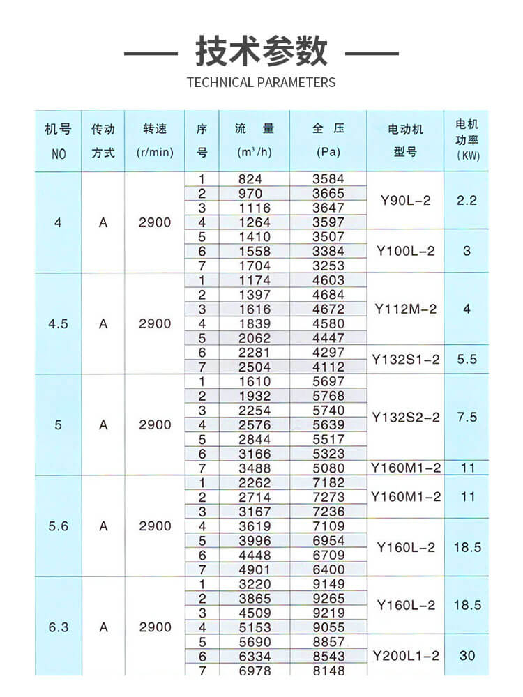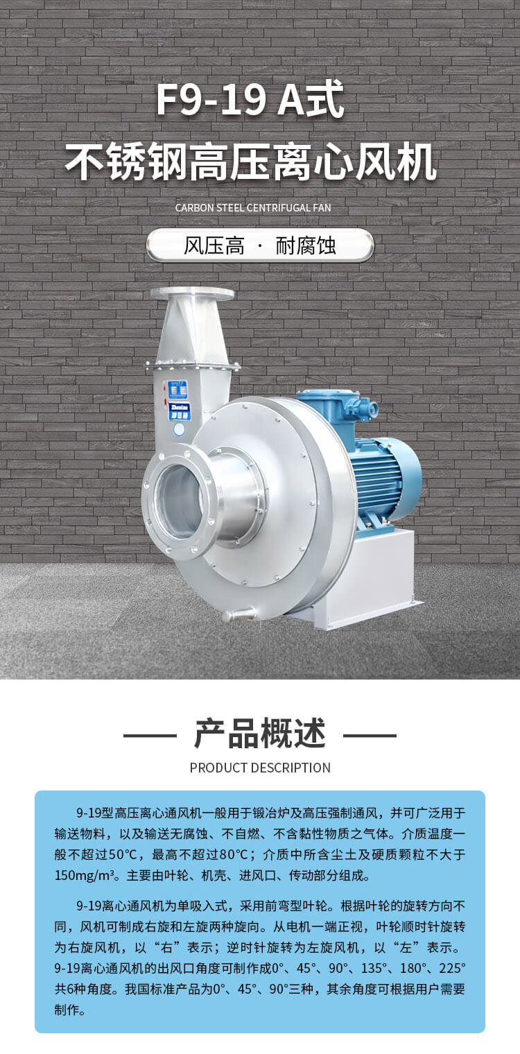 9-19型高压离心通风机一般用于锻冶炉及高压强制通风,并可广泛用于输送物料,以及输送无腐蚀、不自燃、不含黏性物质之气体。介质温度一般不超过50°C,最高不超过80°C;介质中所含尘土及硬质颗粒不大于150mg/m3。主要由叶轮、机壳、进风口、传动部分组成。适用于锻冶、玻璃、陶冶、无线电、电镀、蓄电池等行业高压强制通风及粮食、饲料、矿粉等加工行业的物料输送。