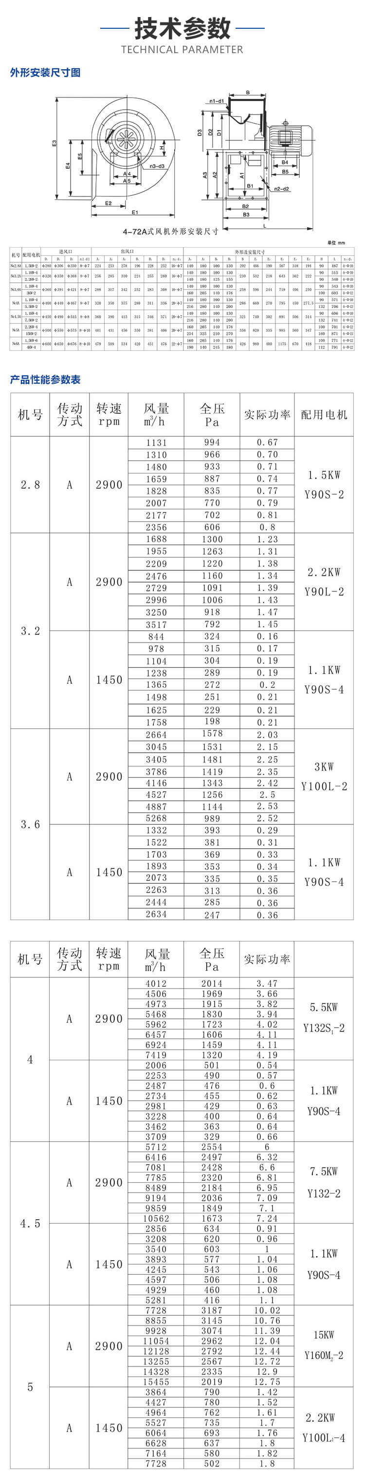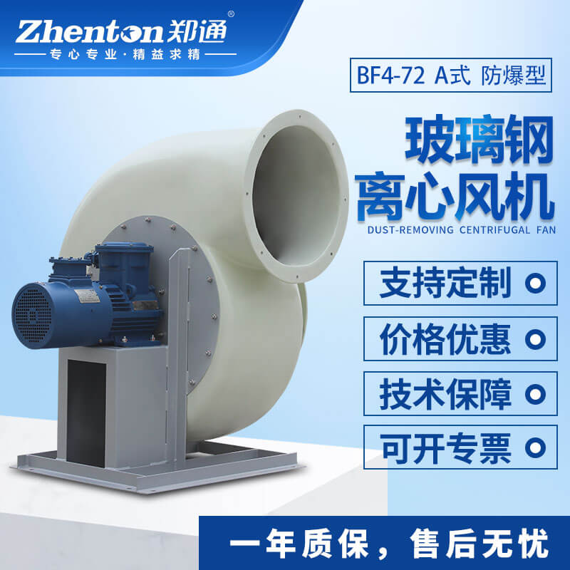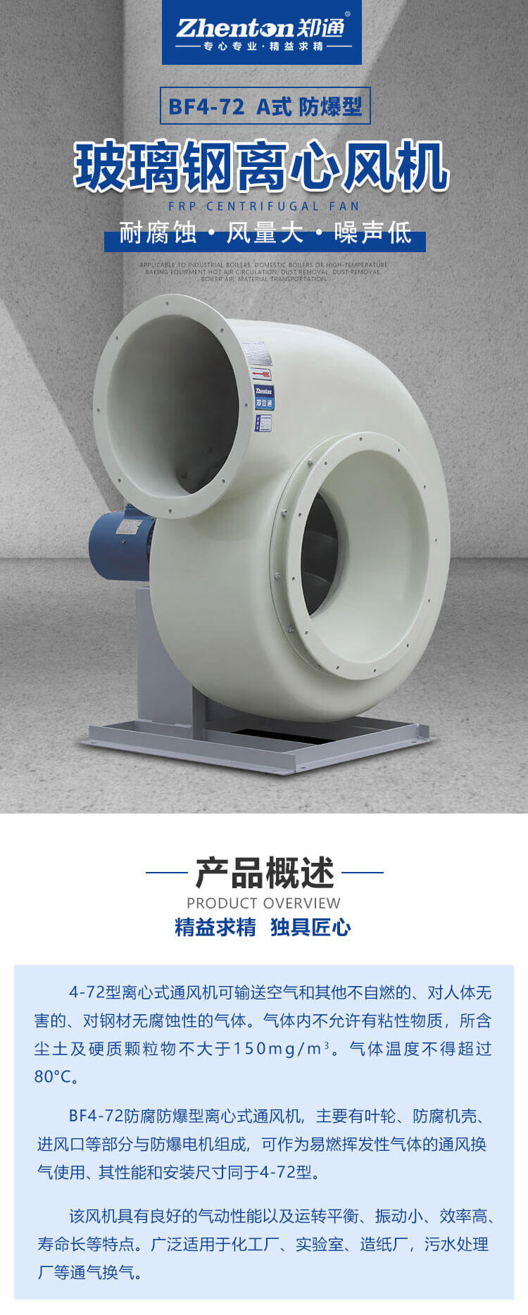 BF4-72防腐防爆型离心式通风机,主要有叶轮、防腐机壳、进风口等部分与防爆电机组成,可作为易燃挥发性气体的通风换气使用、其性能和安装尺寸同于4-72型。