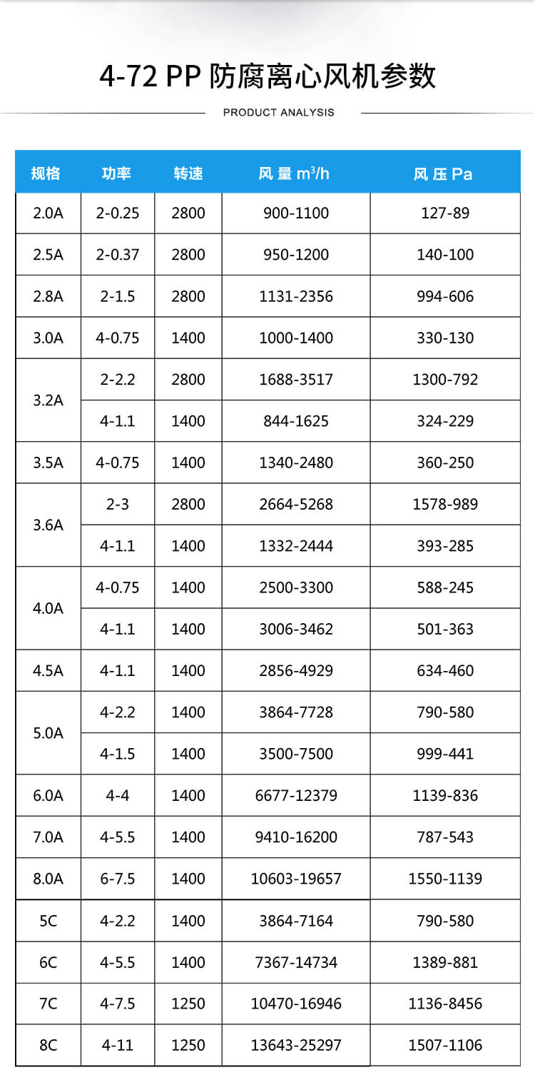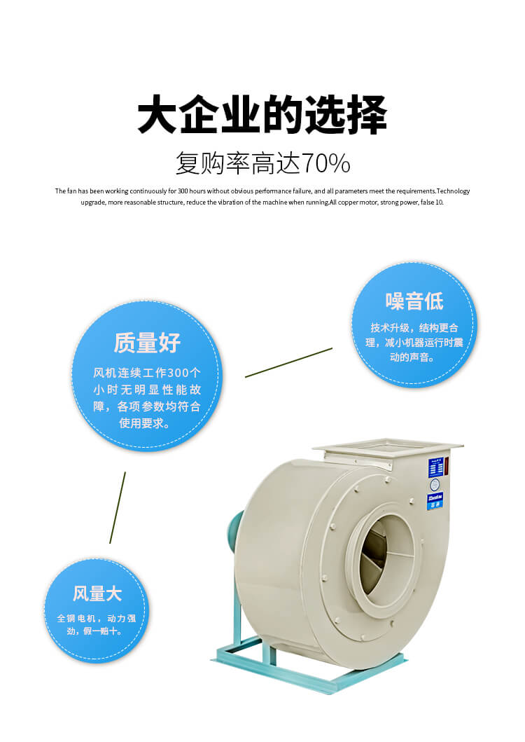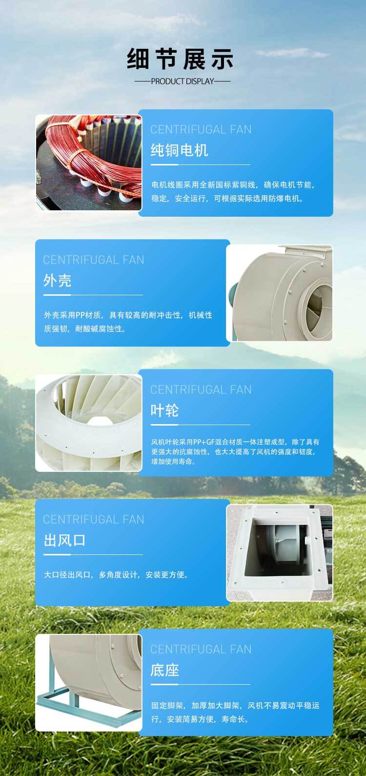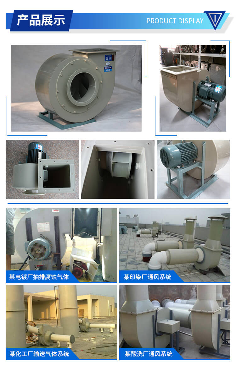 适用于化工、纺织、电镀、实验室等场所排送含有一定浓度的酸、碱、盐等腐蚀性气体,也可以作为一般工厂的建筑物通风换气用