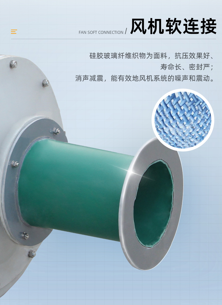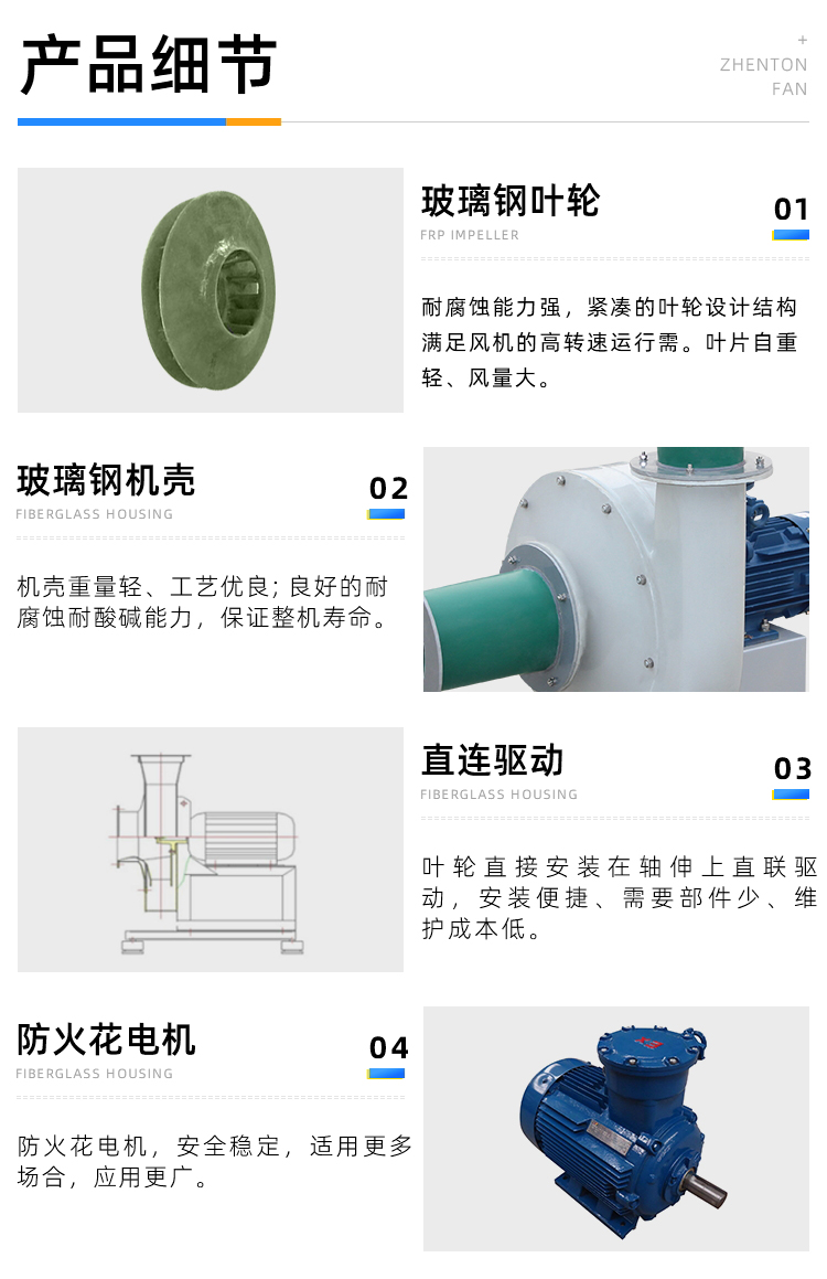 要由玻璃钢材质制成,大机号也可以制成皮带驱动,耐腐蚀性好、不易老化。噪声低、重量轻