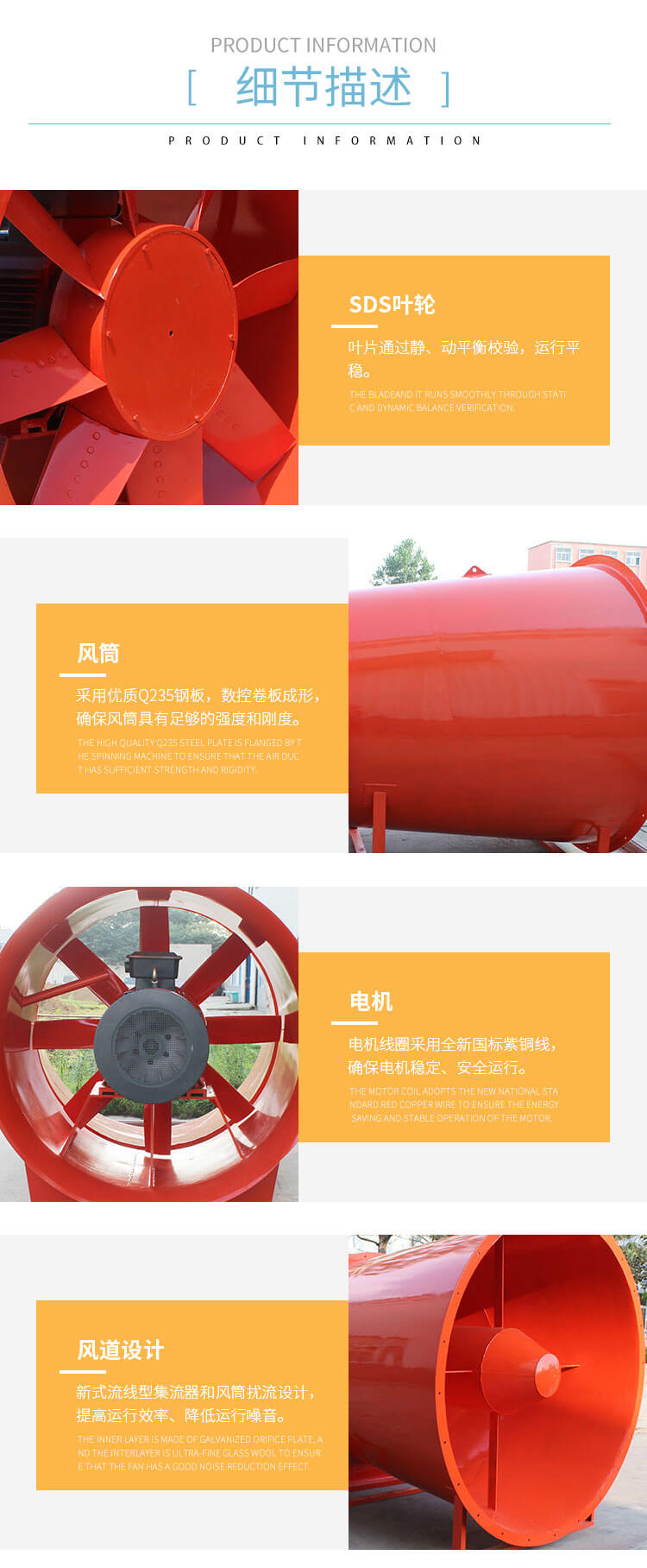 外壳由美国进口专用机床旋压翻边成形、叶轮段内壁经精加工, 耐腐蚀、可靠性、可逆式双向均可通风, 也可增加消声器来减少其噪声。直联驱动,维护工作量小。