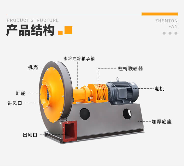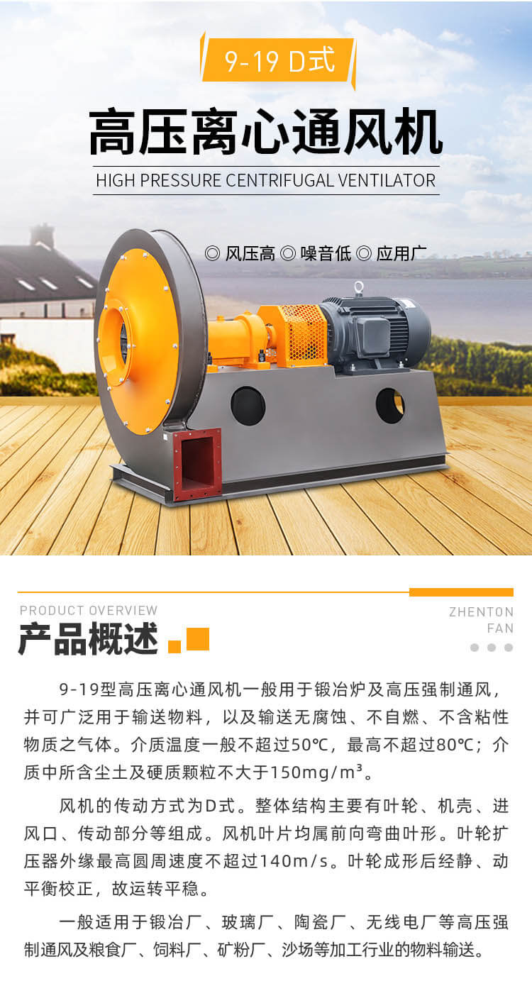 9-19型高压离心通风机一般用于 锻冶炉及高压强制通风, 并可广泛用于输送物料,以及输送无腐蚀、不自燃、不含粘性 物质之气体。介质温度一般不超过50°C,最高不超过80°C;介 质中所含尘土及硬质颗粒不大于150mg/m 。