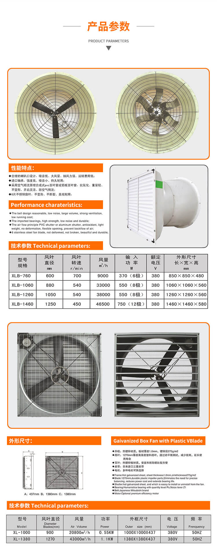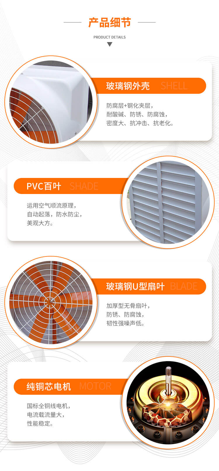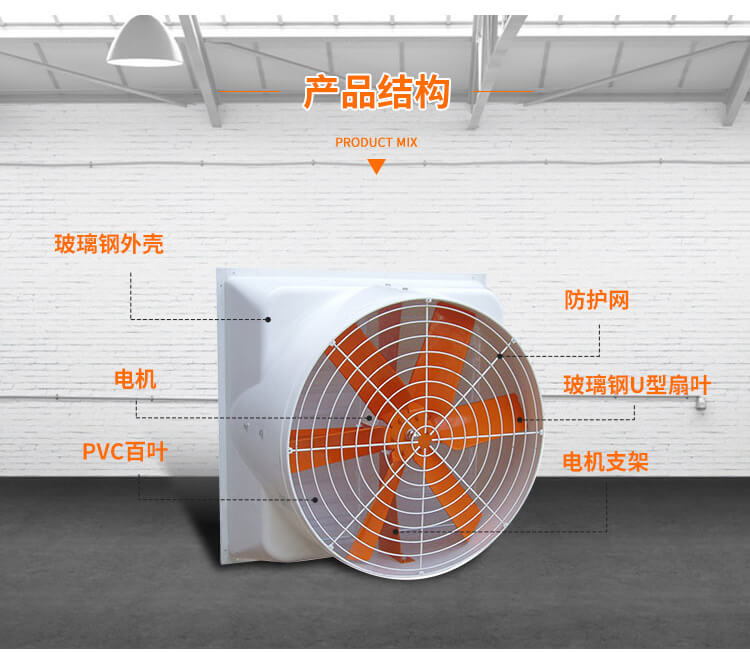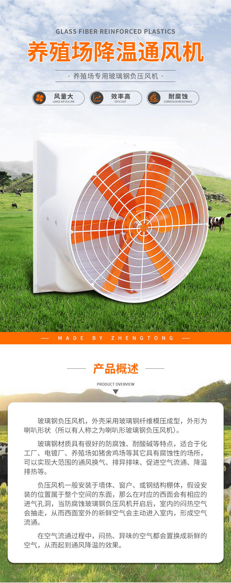 玻璃钢材质具有很好的防腐蚀、耐酸碱等特点,适合于化工厂、电镀厂、养殖场如猪舍鸡场等其它具有腐蚀性的场所,可以实现大范围的通风换气、排异排味、促进空气流通、降温排热等。