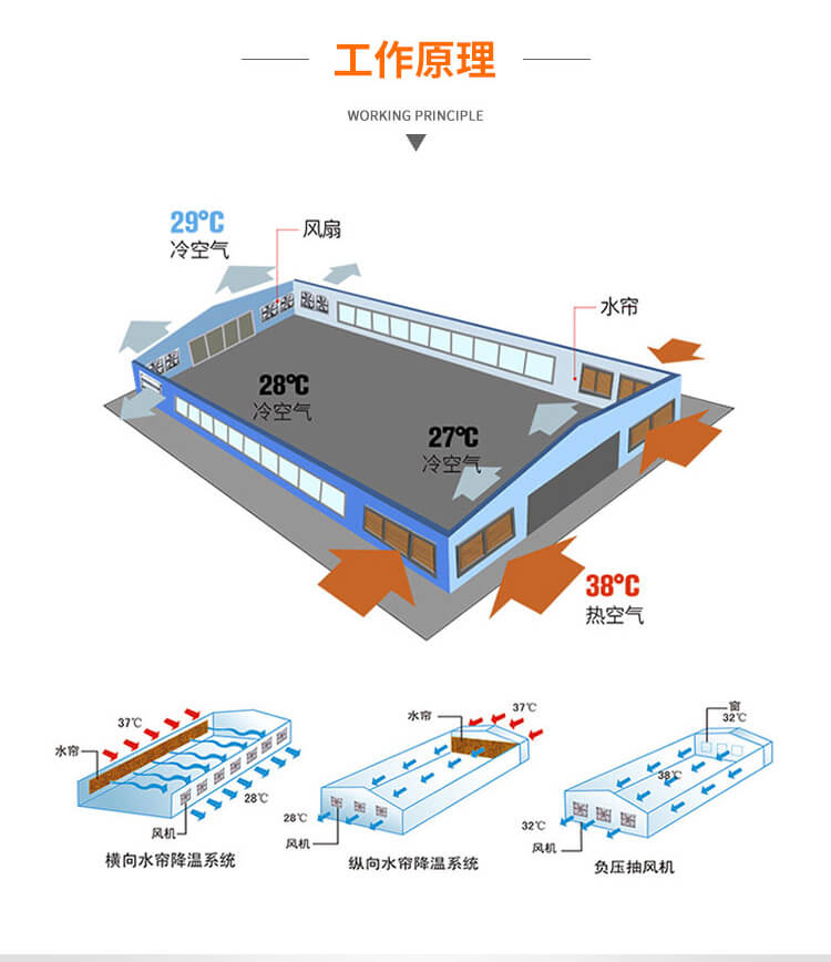 玻璃钢负压风机,外壳采用玻璃钢纤维模压成型,外形为喇叭形状(所以有人称之为喇叭形玻璃钢负压风机)。负压风机一般安装于墙体、窗户、或钢结构棚体,假设安装的位置属于整个空间的东面,那么在对应的西面会有相应的进气孔洞,当防腐蚀玻璃钢负压风机开启后,室内的闷热空气会抽走,从而西面室外的新鲜空气会主动进入室内,形成空气流通。 在空气流通过程中,闷热、异味的空气都会置换成新鲜的空气,从而起到通风降温的效果。