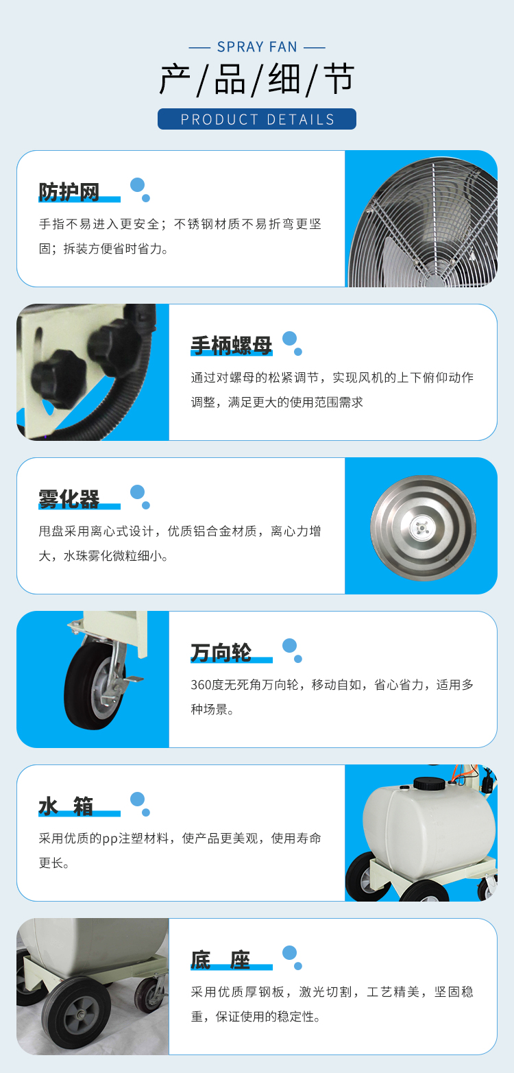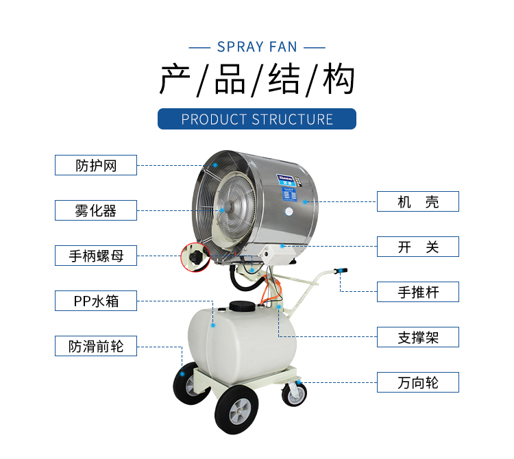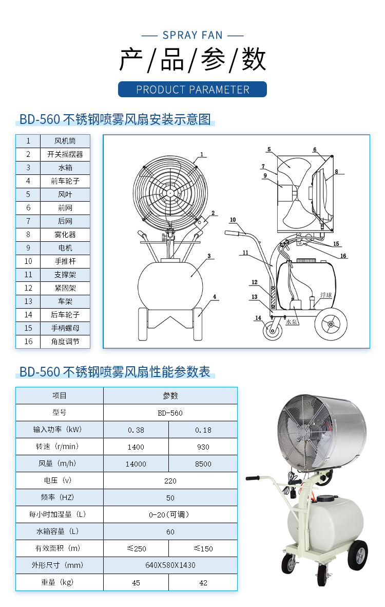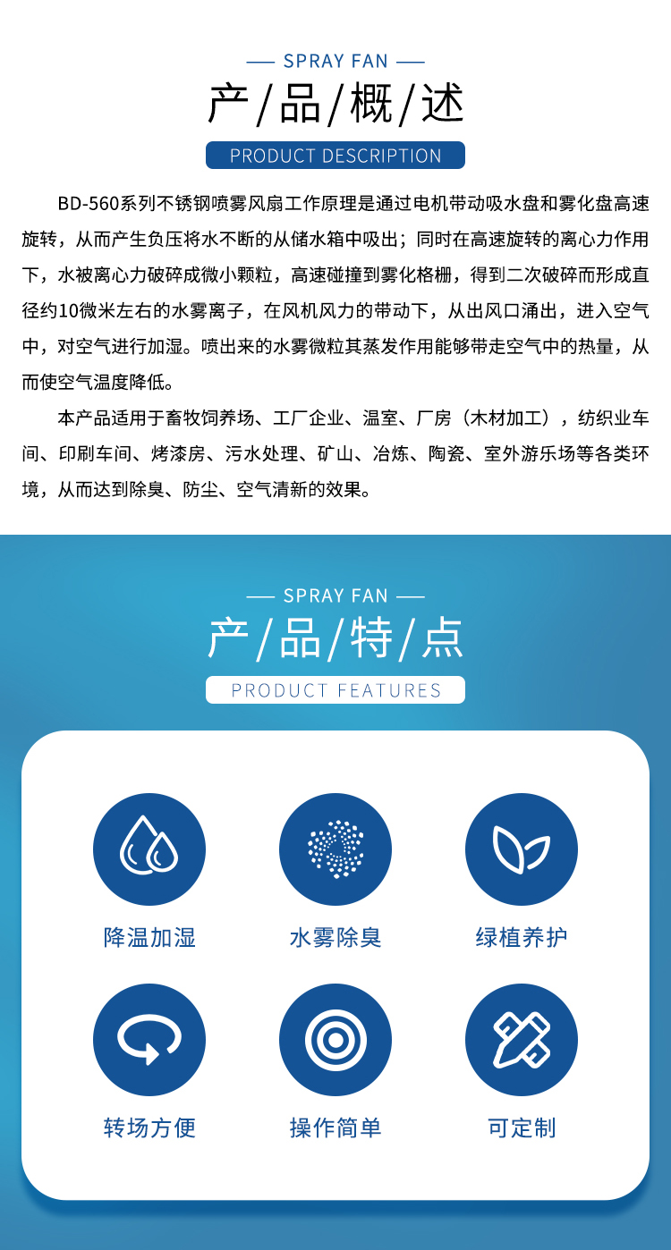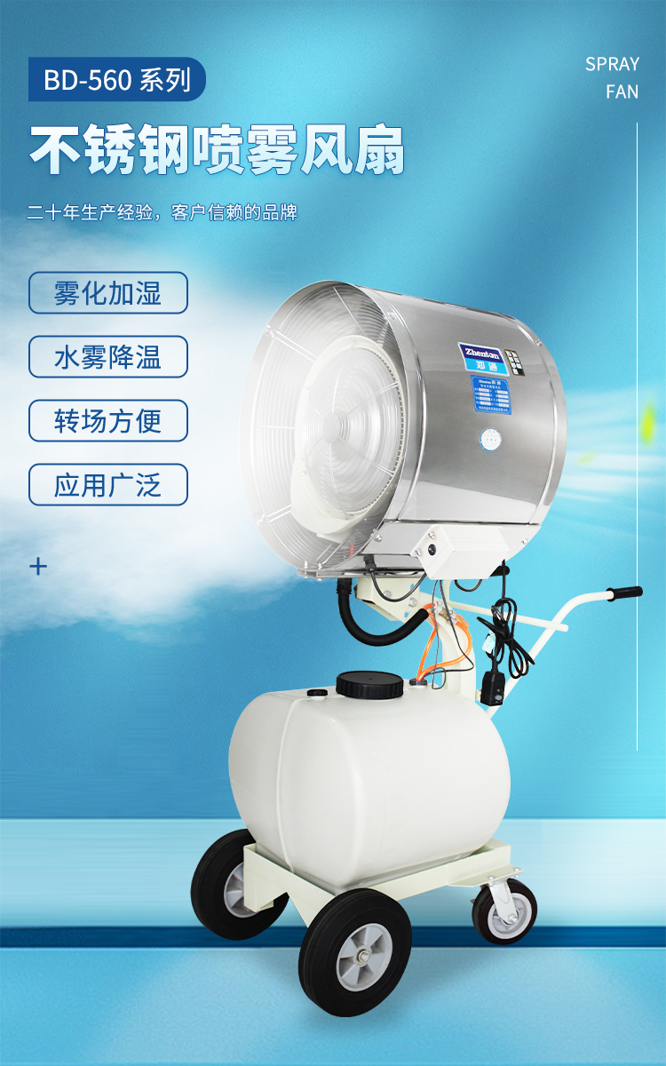 BD-560系列不锈钢喷雾风扇工作原理是通过电机带动吸水盘和雾化盘高速旋转,从而产生负压将水不断的从储水箱中吸出;同时在高速旋转的离心力作用下,水被离心力破碎成微小颗粒,高速碰撞到雾化格栅,得到二次破碎而形成直径约10微米左右的水雾离子,在风机风力的带动下,从出风口涌出,进入空气中,对空气进行加湿。喷出来的水雾微粒其蒸发作用能够带走空气中的热量,从而使空气温度降低。