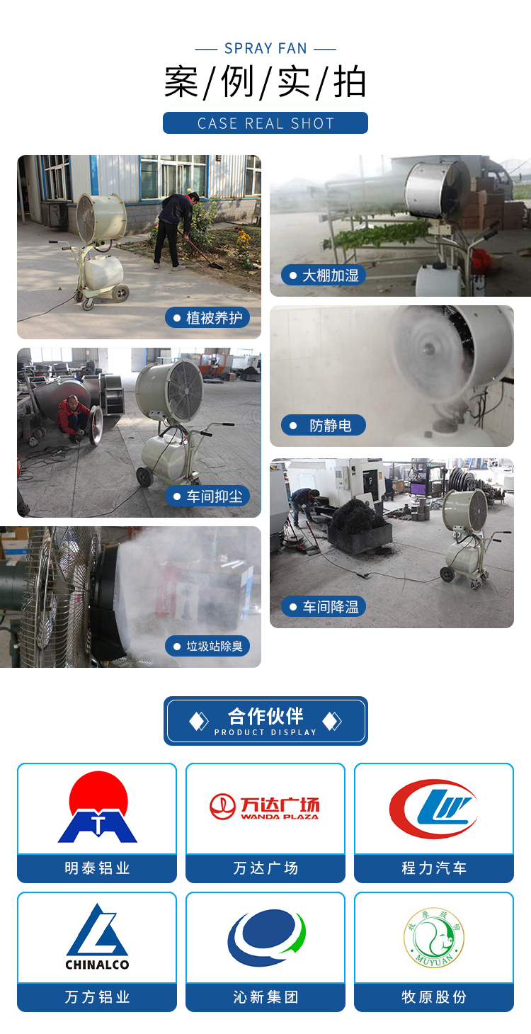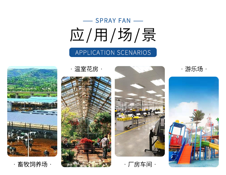 本产品适用于畜牧饲养场、工厂企业、温室、厂房(木材加工),纺织业车间、印刷车间、烤漆房、污水处理、矿山、冶炼、陶瓷、室外游乐场等各类环境,从而达到除臭、防尘、空气清新的效果。