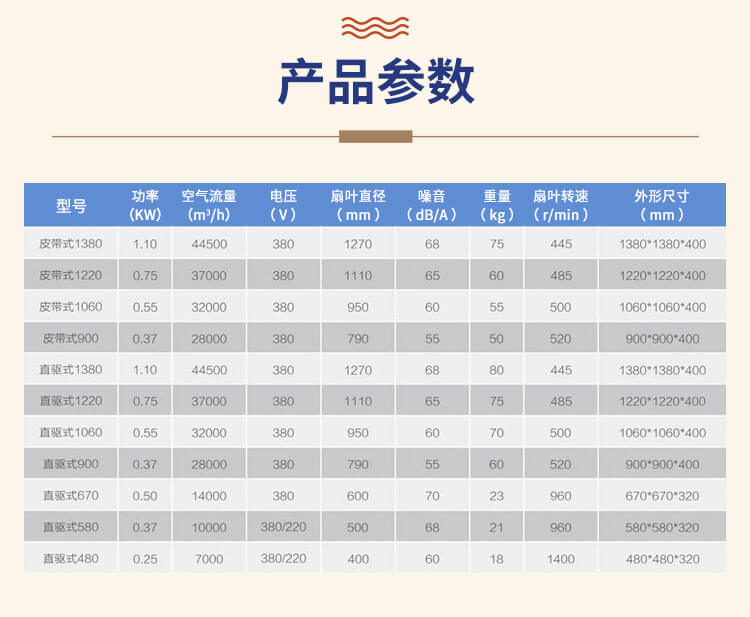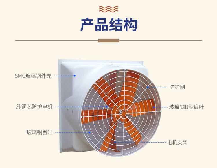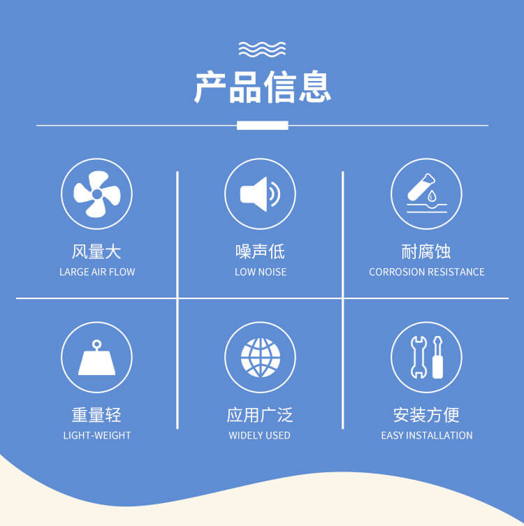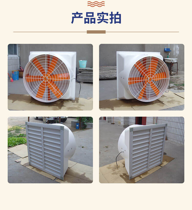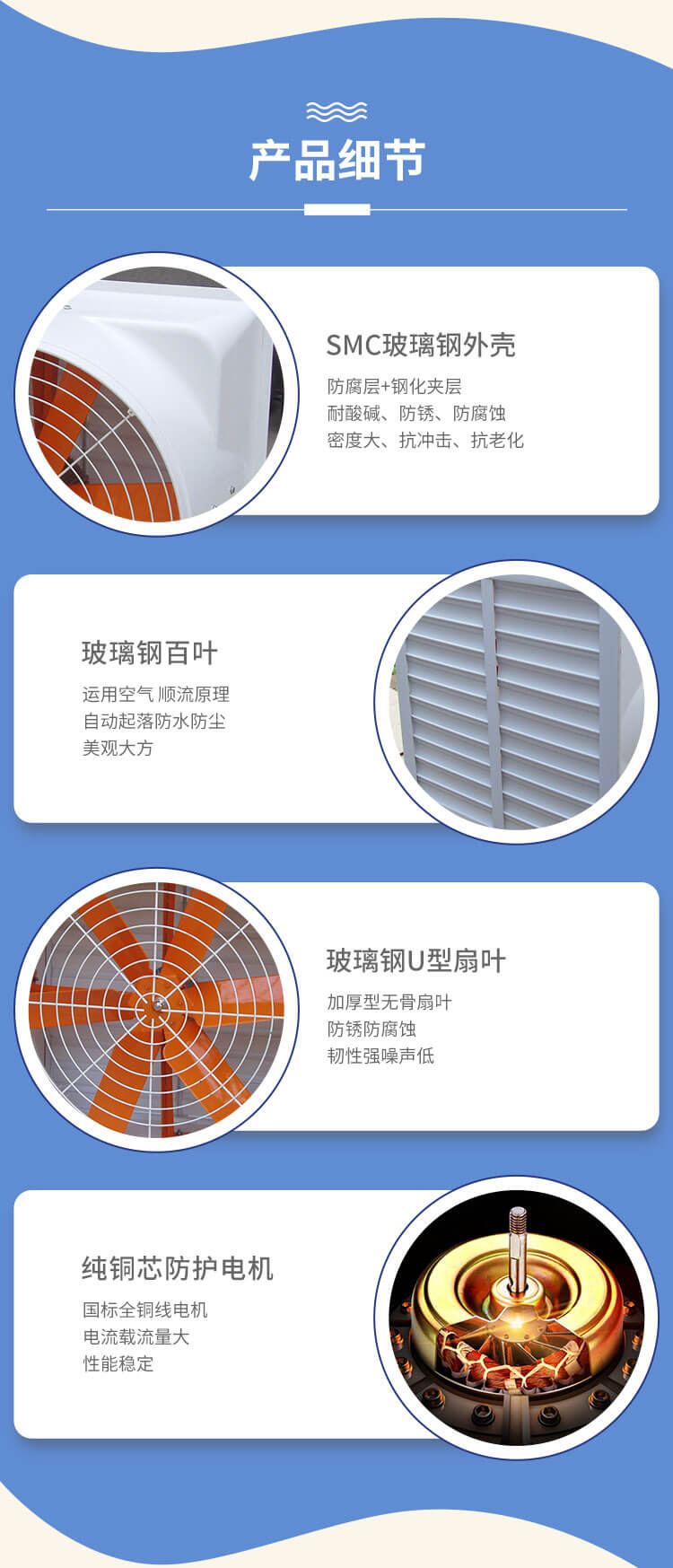具有抗紫外线,耐酸碱,防腐、防锈等特点,采用CAD/CAM优化设计制造,全压高,风量大,噪音低,耗能小,运行平稳,寿命长,百叶窗可通过手动或自动启动达到防尘防水的目的,美观大方,电机下置,维护保养更方便。