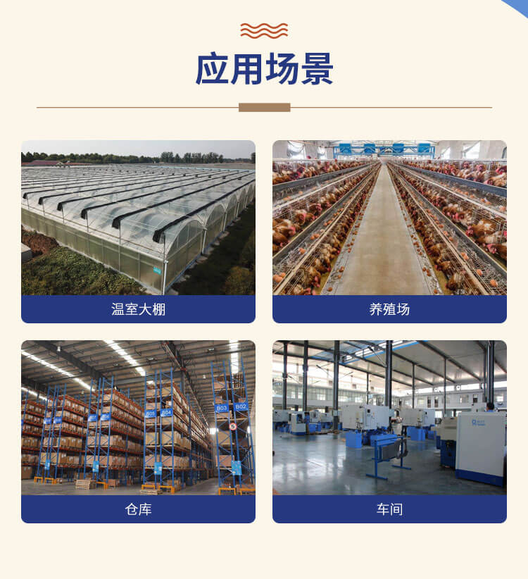 畜牧业、生产车间、仓库等易产生废弃、高温、有异味、散热或对空气湿度有限制场所,对空气干湿度无限制领域通风换气。