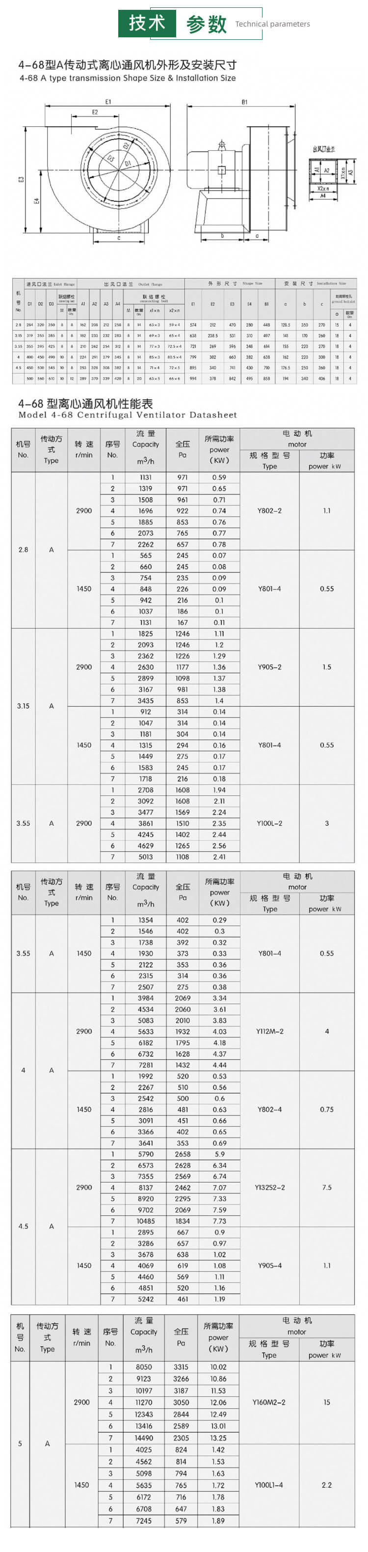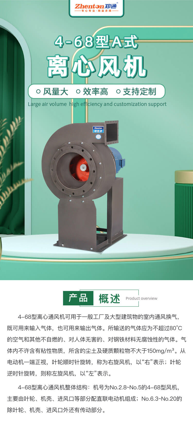 4-68型离心通风机可用于一般工厂通风排尘及大型建筑物的室内通风换气。