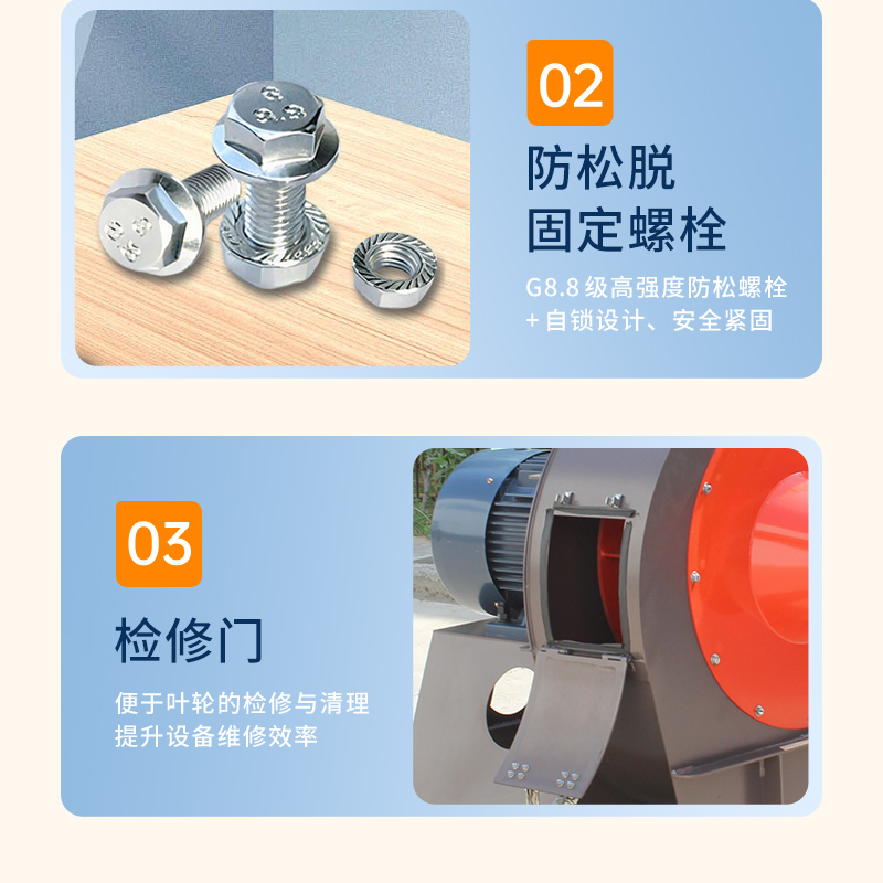 FC6-48物料输送离心风机系列,粮食加工中输送谷物、面粉,建材行业输送水泥粉、石灰粉,化工领域输送非腐蚀性颗粒原料,以及饲料厂输送饲料粉、塑料厂输送塑料颗粒等场景的物料输送。整体采用加厚碳钢蜗壳、圆弧形专用叶轮、纯铜电机设计。质量可靠,耐磨性能强喷塑烤漆工艺,不掉漆,不生锈,用个十年八年没问题。