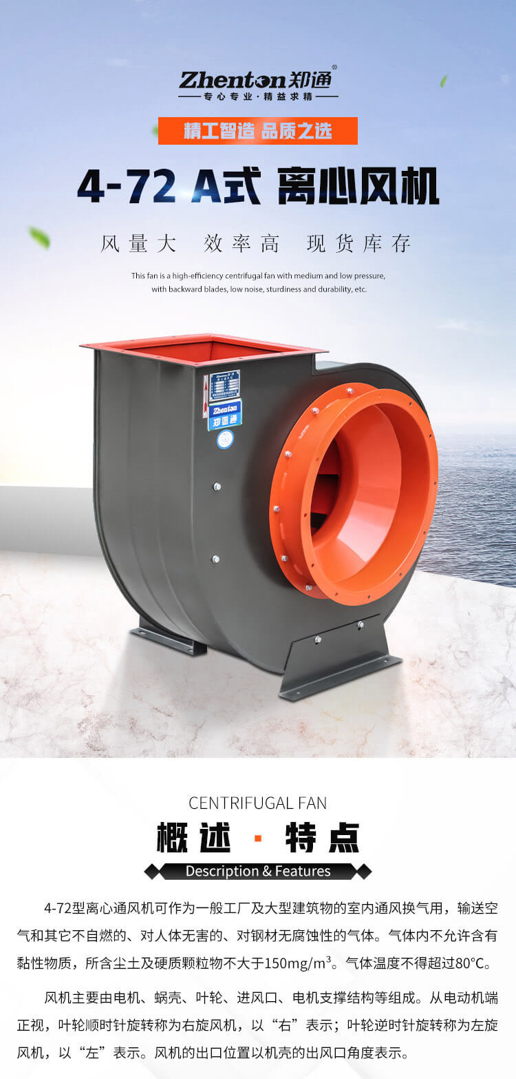 4-72型离心通风机可作为一般工厂及大型建筑物的室内通风换气用,输送空气和其它不自燃的、对人体无害的、对钢材无腐蚀性的气体。气体内不允许含有黏性物质,所含尘土及硬质颗粒物不大于150mg/m3。气体温度不得超过80°C。