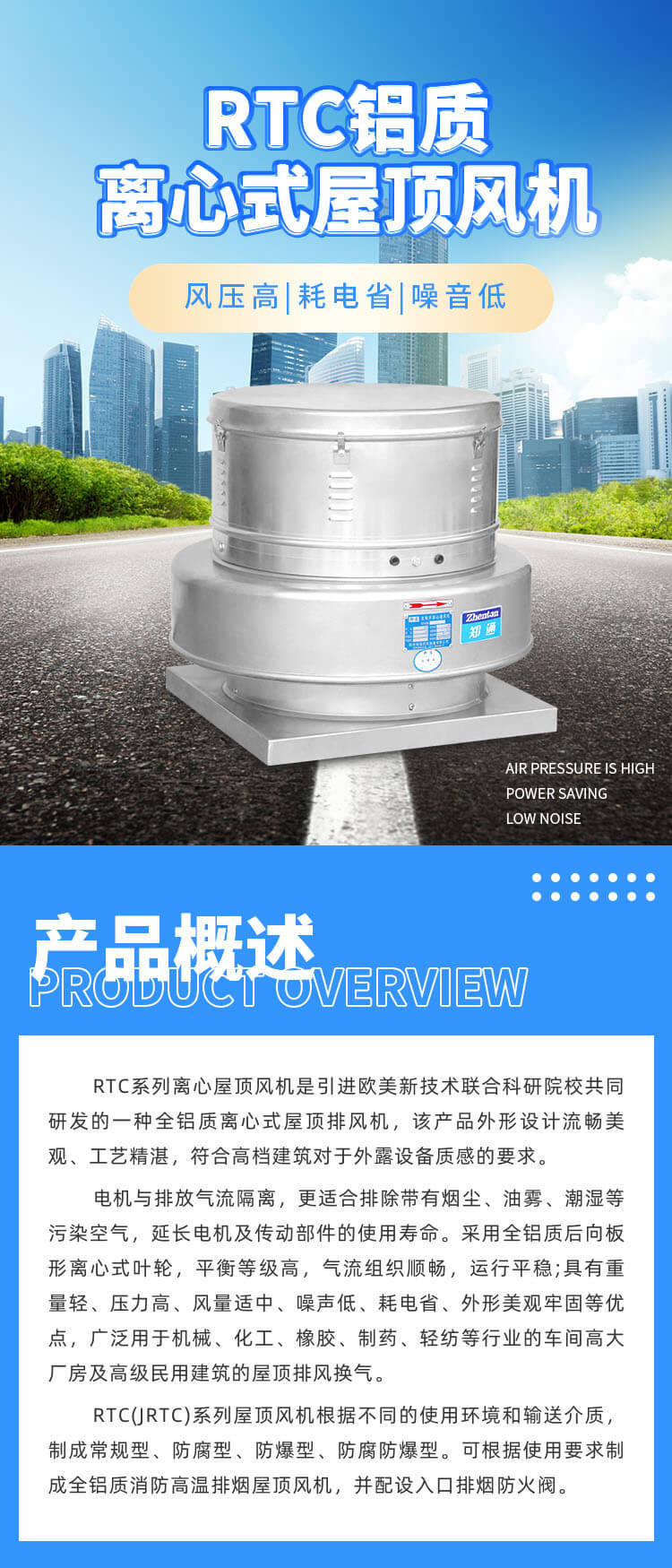 产品特点: RTC系列离心屋顶风机是引|进欧美先进技术联合科研院校共同研发的一种全铝质离心式屋顶排风机,该产品外形设计流畅美观,工艺精湛,符合高档建筑对于外露设备质感的要求。