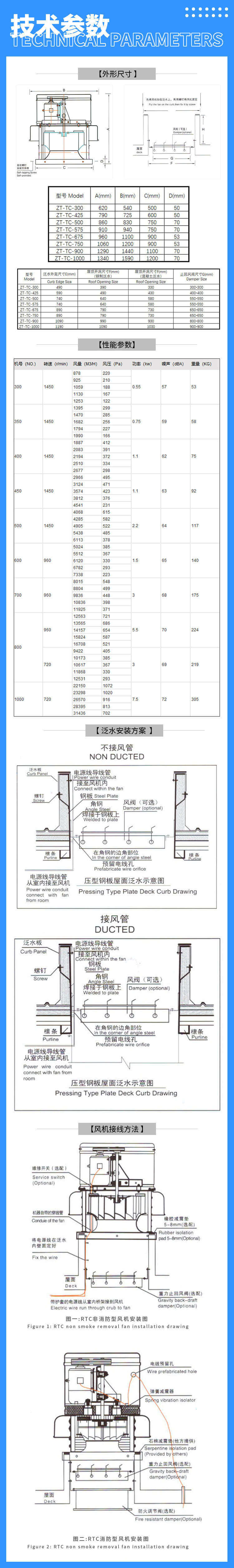 RTC(JRTC)系列屋顶风机根据不同的使用环境和输送介质,制成常规型、防腐型、防爆型、防腐防爆型。可根据使用要求制成全铝质消防高温排烟屋顶风机,并配设入口排烟防火阀。