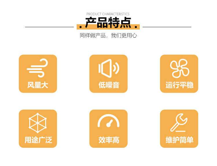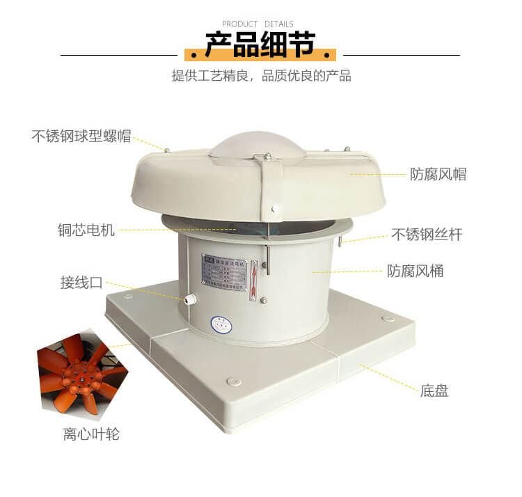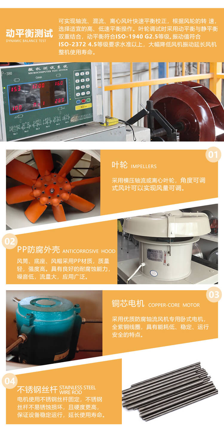 外壳及风轮可根据不同的腐蚀性气体而采用不同的材质,噪音低、重量轻、运转平稳、效率高、防腐性能好。