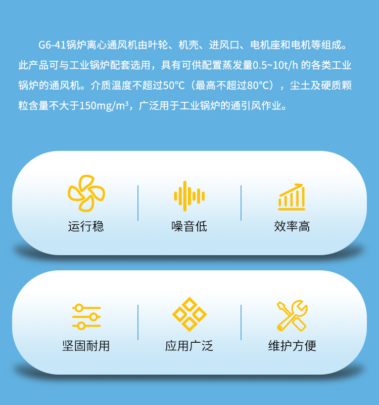 1.适用于燃用各种煤质 并配有消烟除尘装置的、 蒸发量0.5~ 10t/h的各 类工业锅炉。 2、高温烘烤设备的热风 循环风机。 3、使用环境:气体介质 中不含腐蚀及易燃易爆 气体,介质中粉尘及硬 颗粒杂质含量不超过 200mg/m3,长期运行 介质温度不超过250°C。