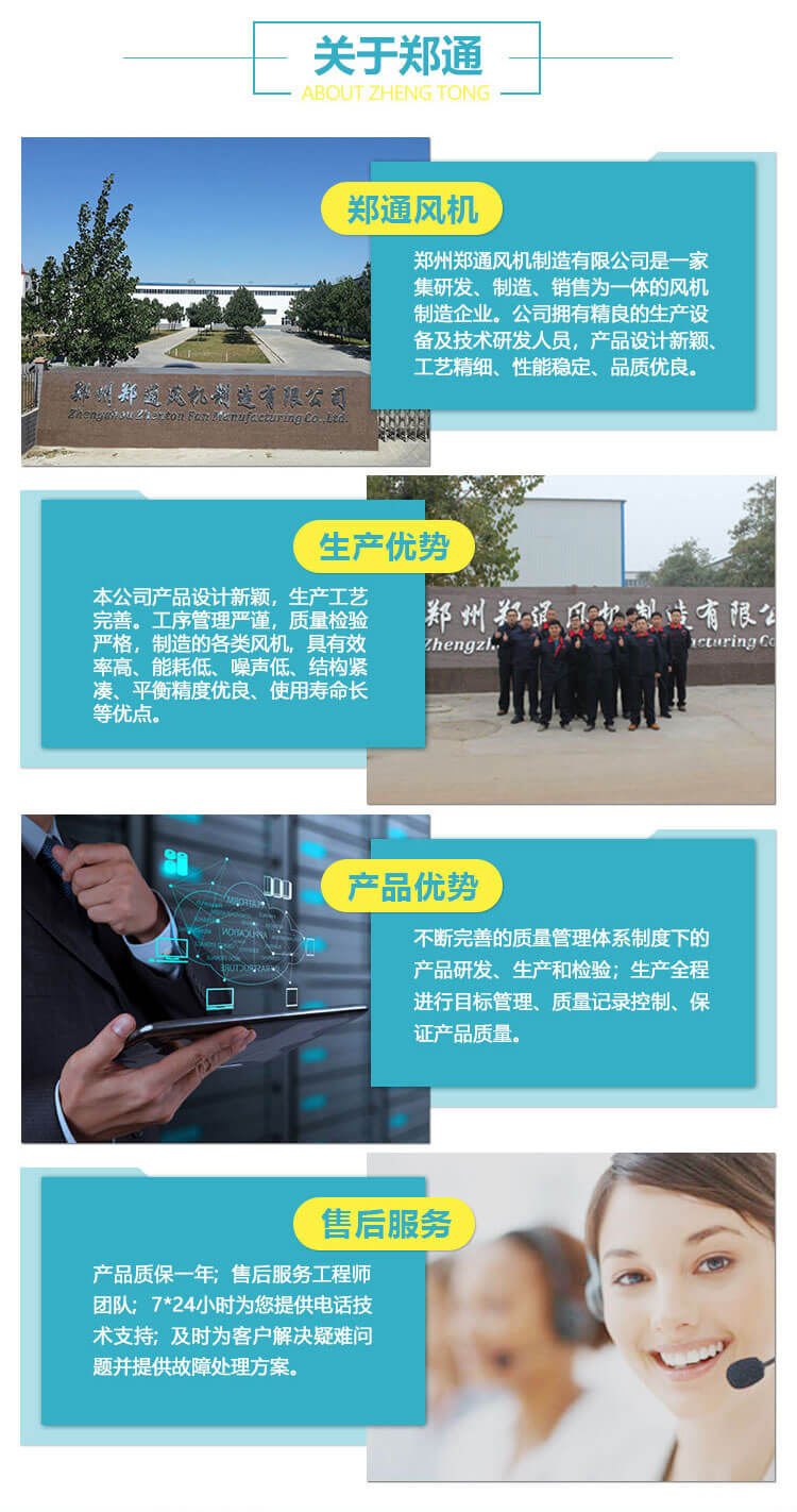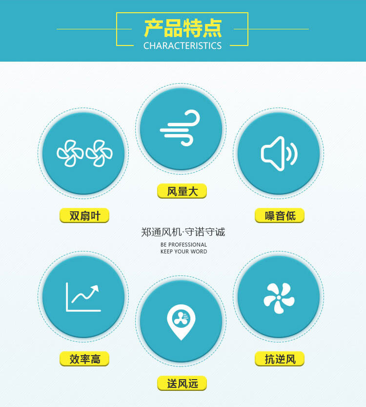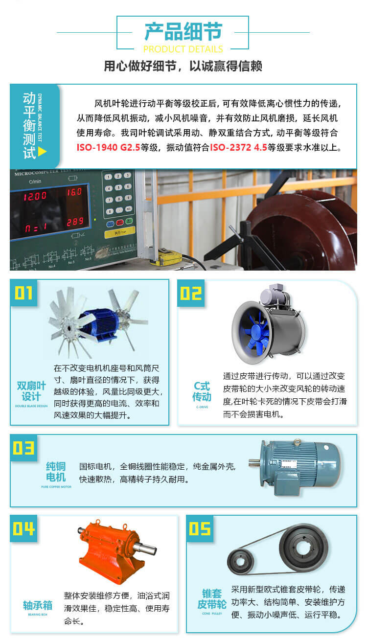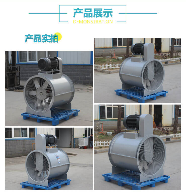 该系列产品由叶轮、机壳、电机、轴承和传动装置组成。在叶轮圆周速度不超过60m/s条件下,配用2900r/min、1450r/min、960r/min三种转速。该系列产品,按叶轮直径不同共分成10种机号,依次排列为No.2/2、3、3/2、 4、5、6、7、8、9、10等。每一 种机号叶片又可安装成15°、20°、25°、 30°、 35°共五种角度。