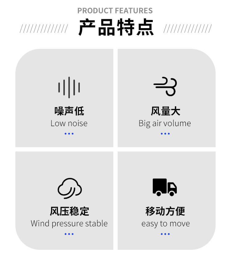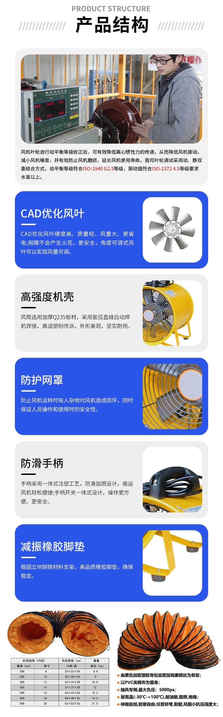 手提式风机口径有200MM,250MM,300MM,350MM,400MM,450MM,50OMM,60OMM等。200-350mm重量轻,并配有把手,把手下带有一体式开关;350mm-600mm以上规格可配带脚架,用于调节吹风仰角高度;400mm-600mm两侧有提手,方便抬动;也可配脚轮,可在地面上推动,使用非常方便。