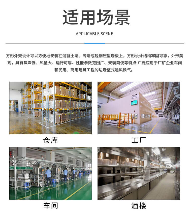 方形壁式轴流风机广泛应用于:石油、军工、化工、机械、冶金等行业的车间、仓库、办公室、加油站等场所的降温通风。如需特殊场合需要防爆的,可定制防爆款。