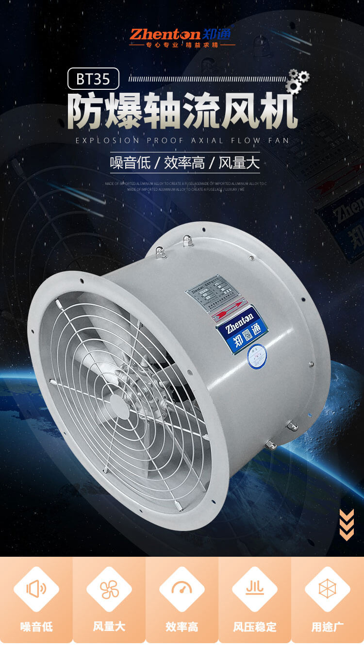 BT35系列防爆轴流风机突破传统产品经过优化设计,采用全新铝合金压铸机翼型可调叶片,噪音低、效率更高、结构简单、坚固耐用。
