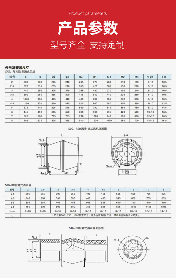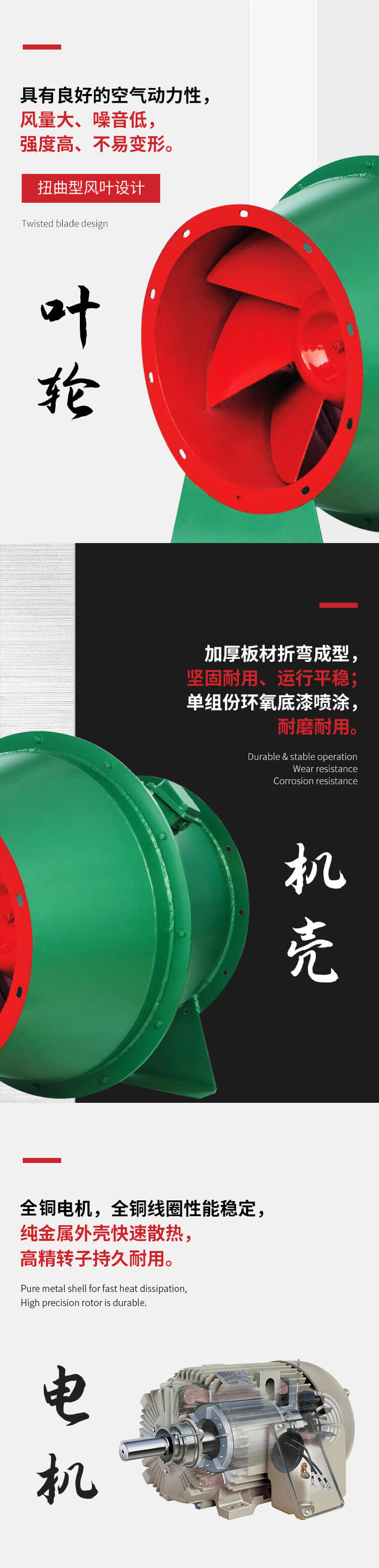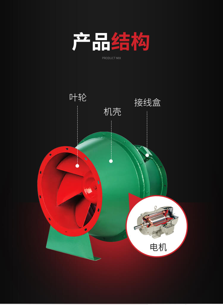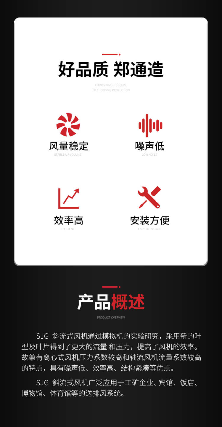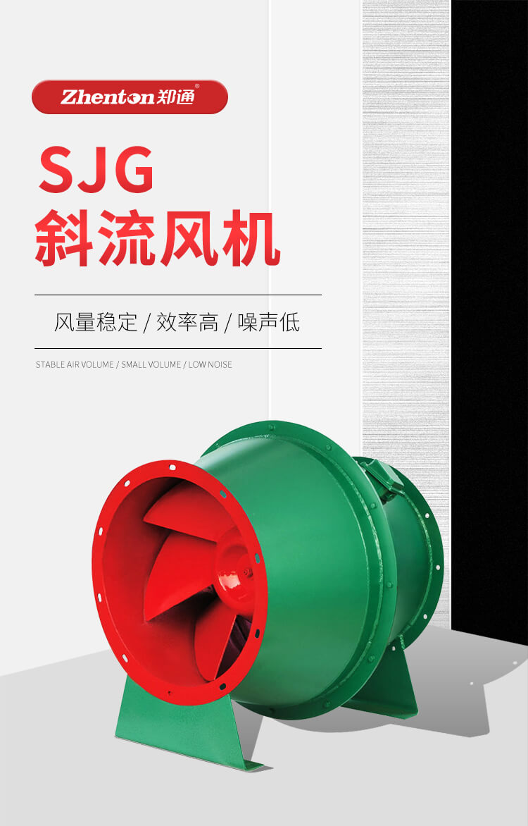 SJG斜流风机广泛应用于工业及民用建筑等各种通风换气场所,特别使用于通风与空调管道的加压、送风和排风