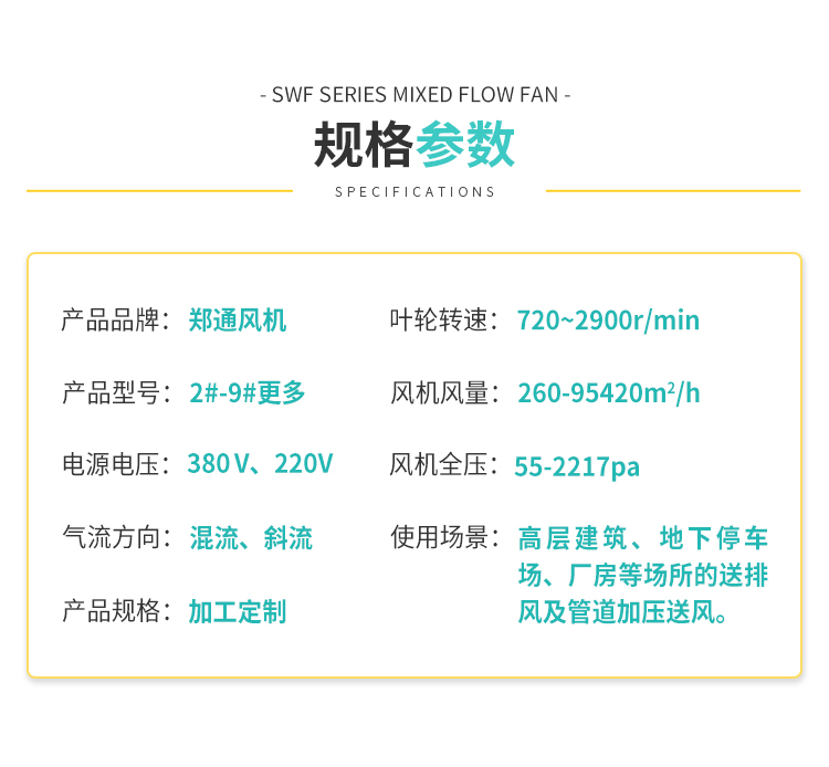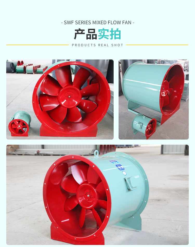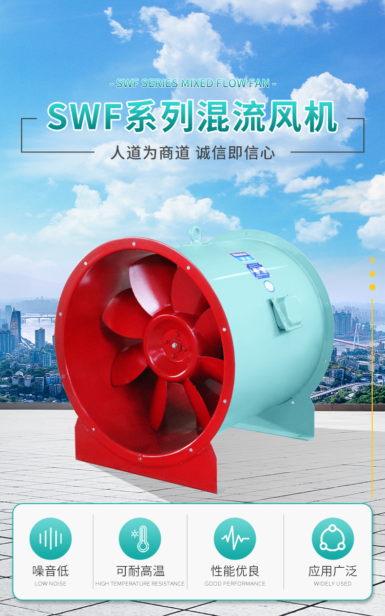 SWF型混流风机多用于冷冻、空调、纺织、船舶、民用建筑等空调工程通风换气,普通材质风机可输送空气和腐蚀性、不自燃的气体。