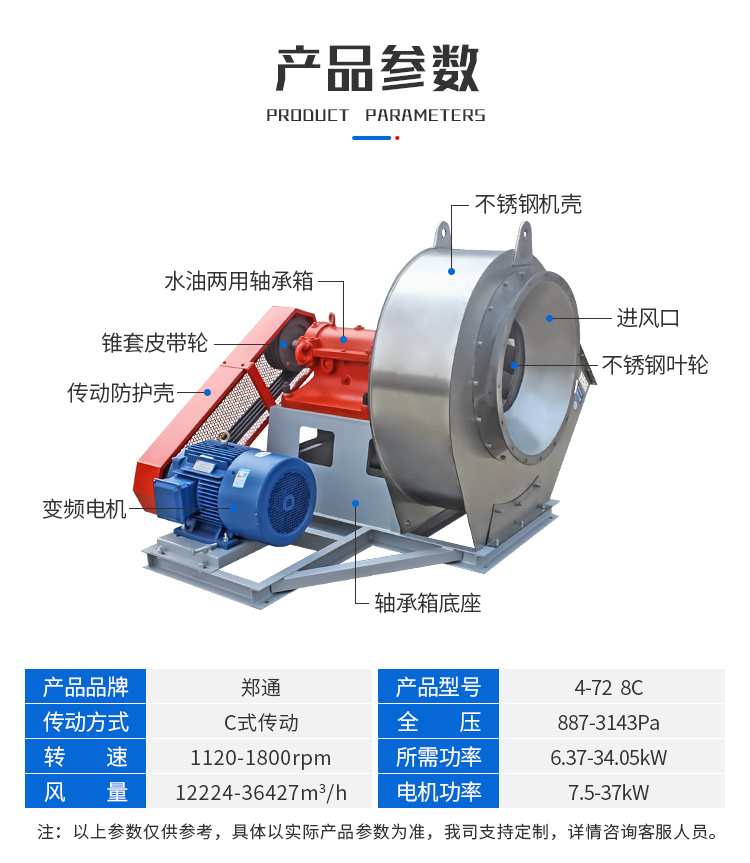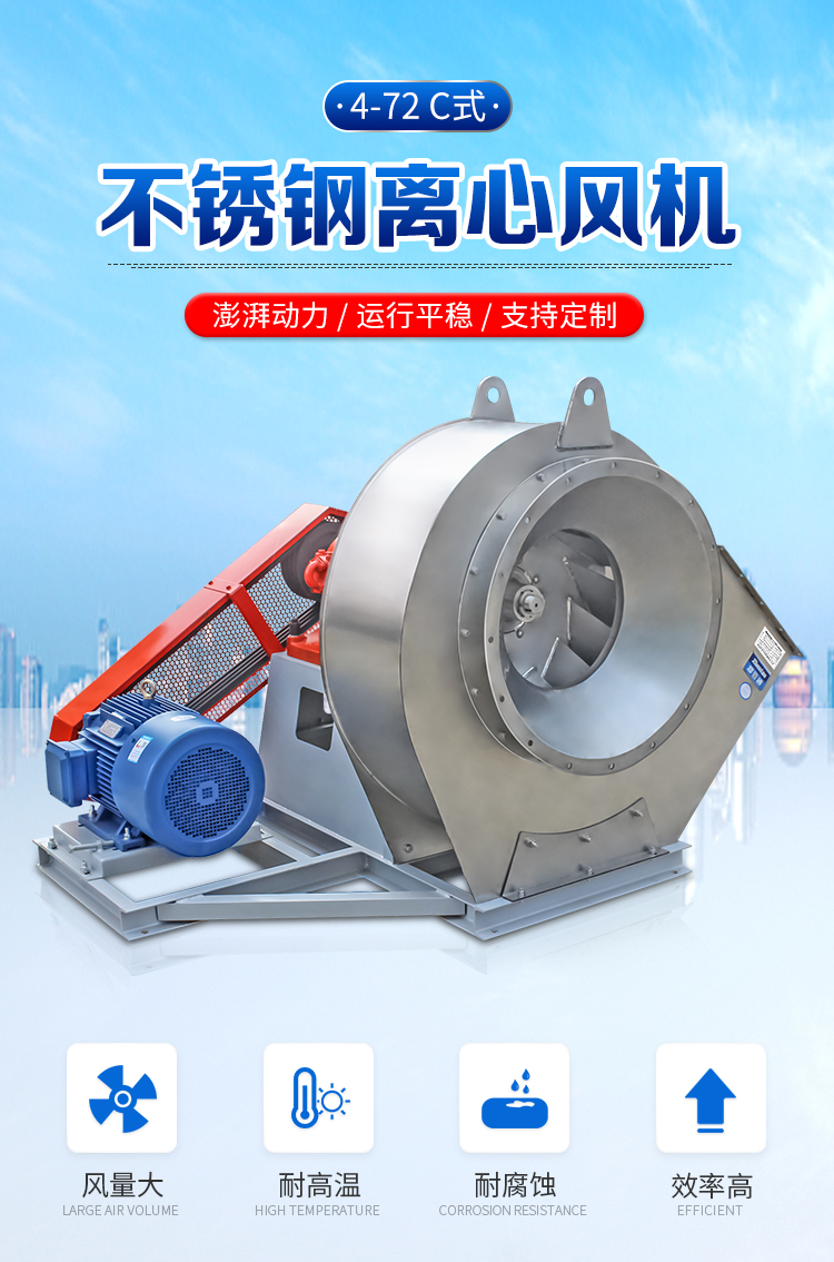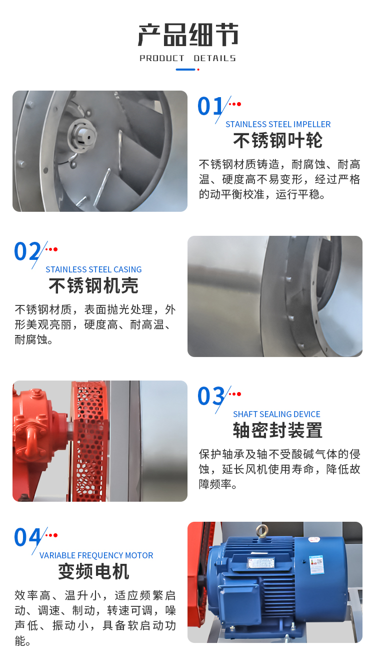 外壳及风轮采用不锈钢风机材质焊接而成,耐高温,能有效防酸碱、防腐蚀