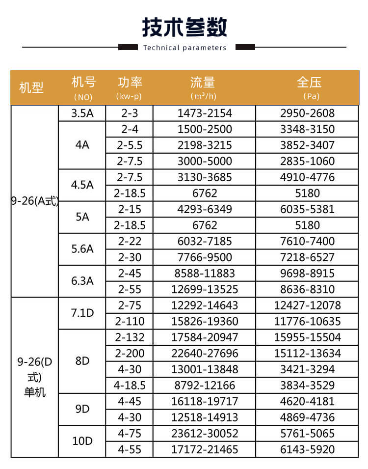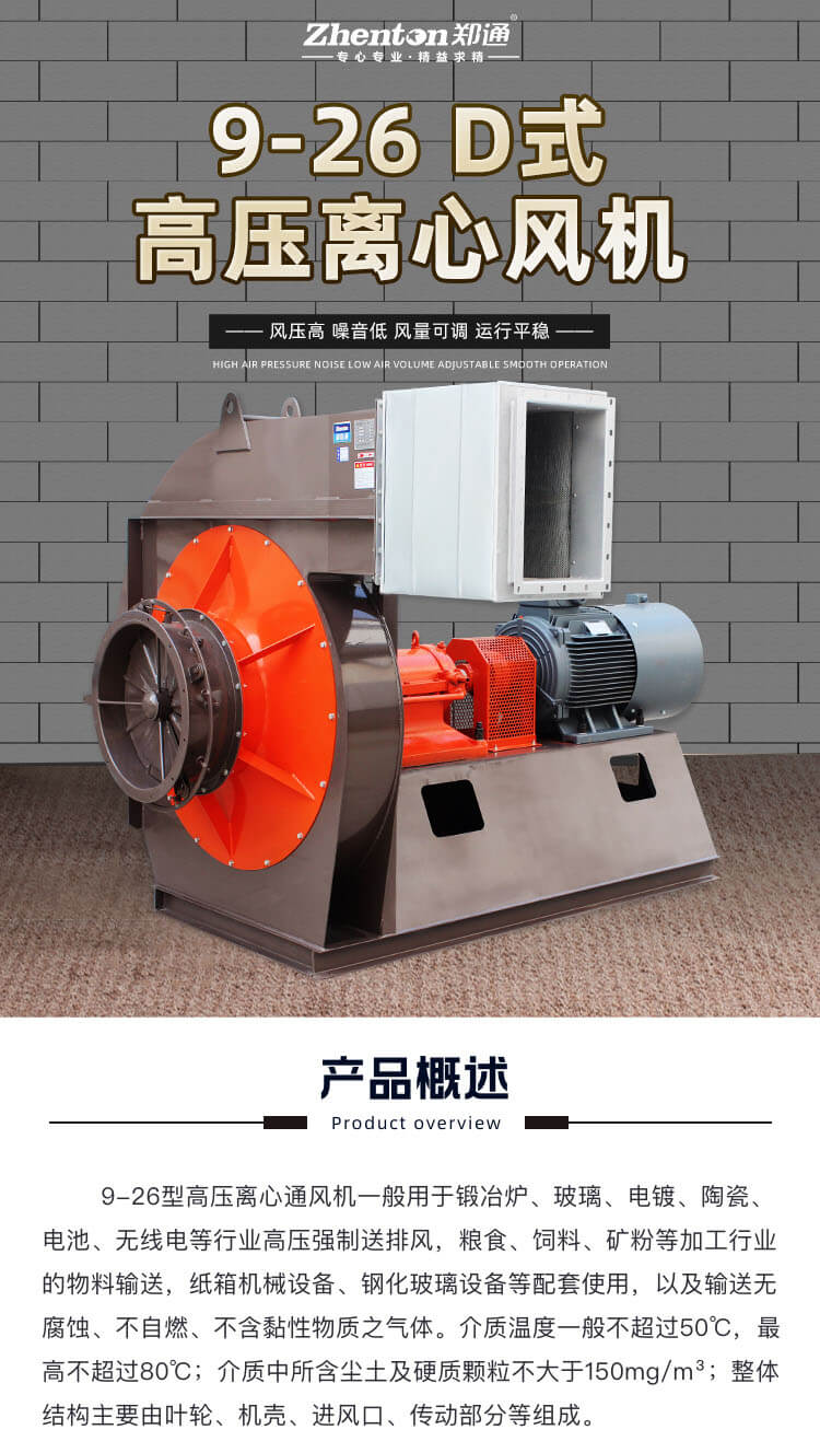 9-26-D系列离心式通风机,具有风压高,效率高,效率区宽,结构紧凑,运行可靠等优点。广泛用于高压强制通风,如锻治炉等场合。