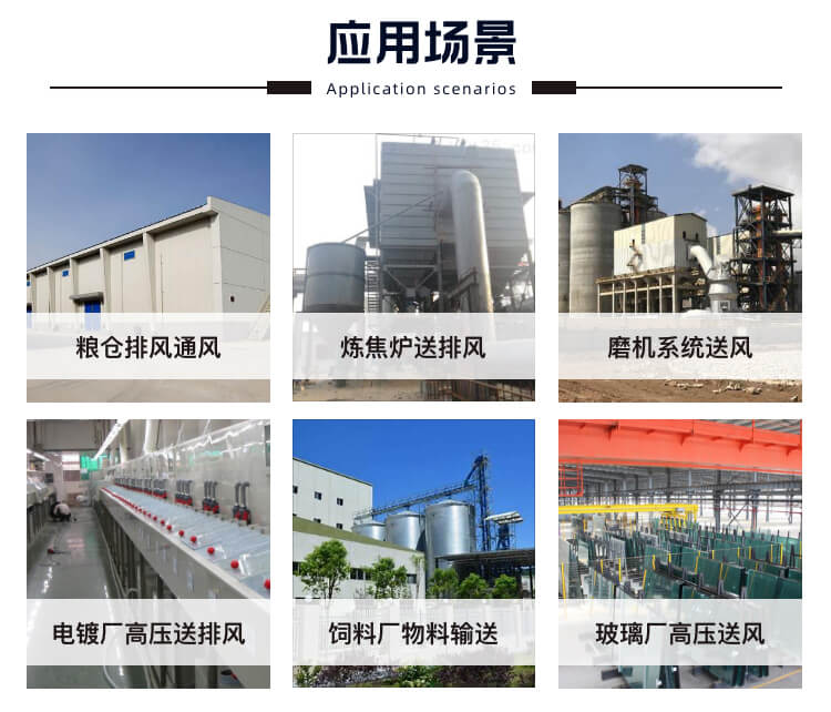一般用于锻冶炉、玻璃、电镀、陶瓷、无线电等行业高压强制通风,并可广泛用于粮食、饲料、矿粉等加工行业的物料输送及纸箱机械设备、钢化玻璃设备等配套使用。输送的介质为空气和其它不自燃、对人体无害、无腐蚀性气体,气体内不允许有粘性物质,所含的尘土及硬质颗粒物不大于150mg/m3,一般通风换气时使用温度不得超过80℃。