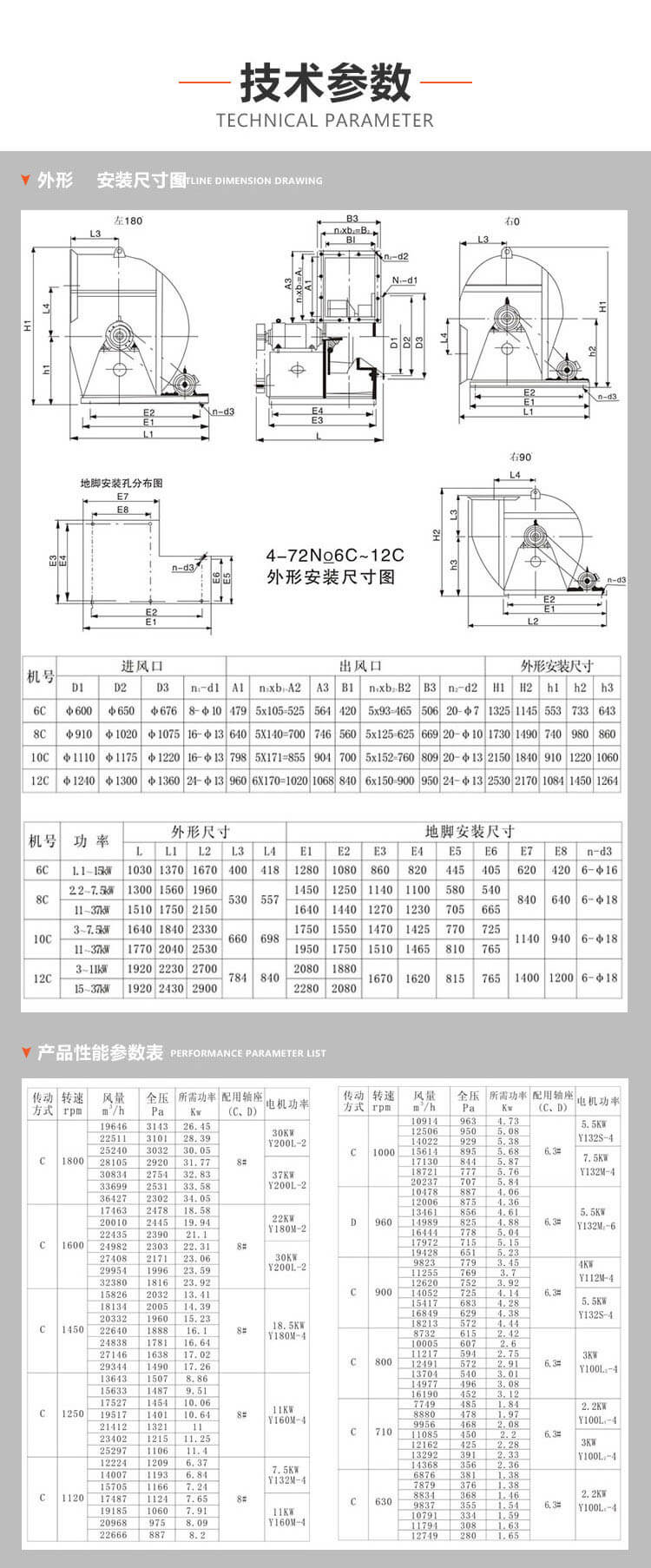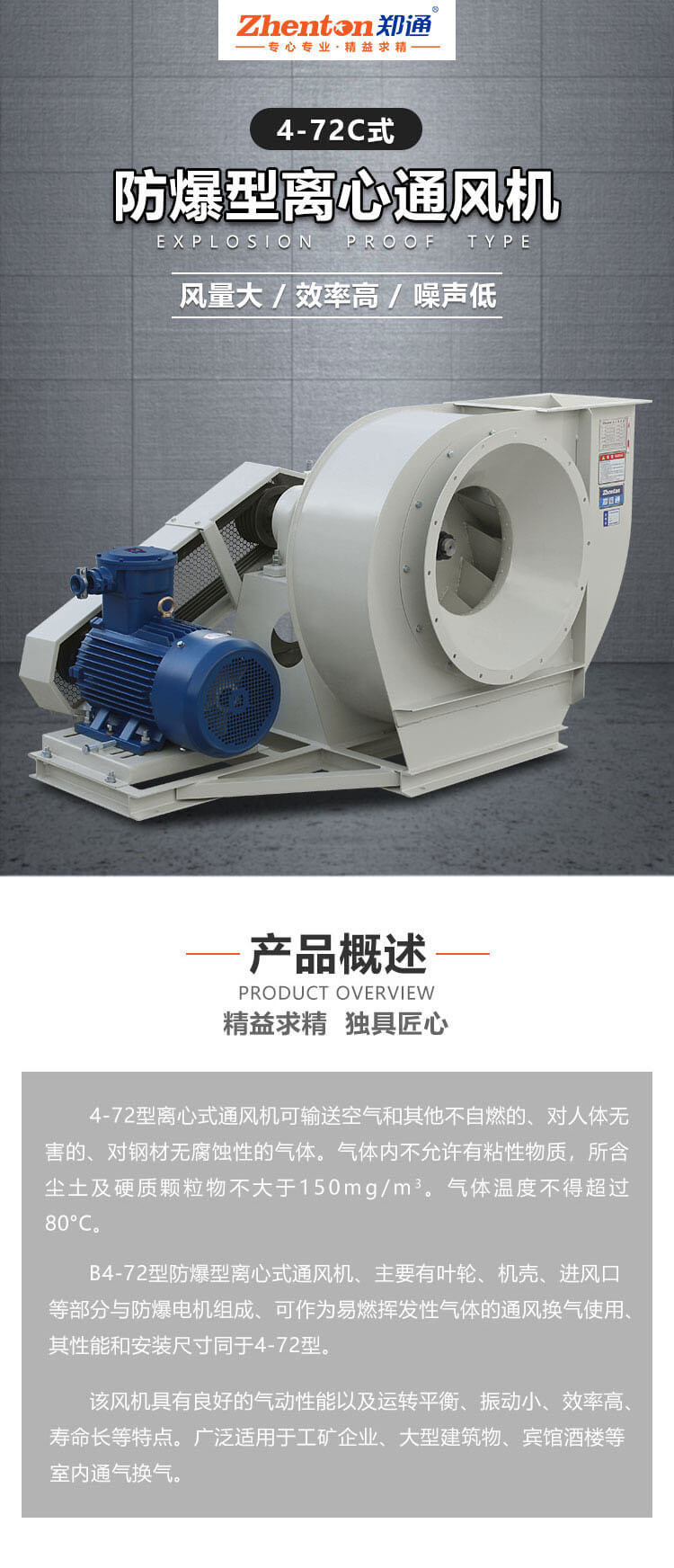 4-72型离心式通风机可输送空气和其他不自燃的、对人体无 害的、对钢材无腐蚀性的气体。气体内不允许有粘性物质,所含 尘土及硬质颗粒物不大于150mg/m3。气体温度不得超过 80°C。B4-72型防爆型离心式通风机、主要有叶轮、机壳、进风口 等部分与防爆电机组成、可作为易燃挥发性气体的通风换气使用、 其性能和安装尺寸同于4-72型。