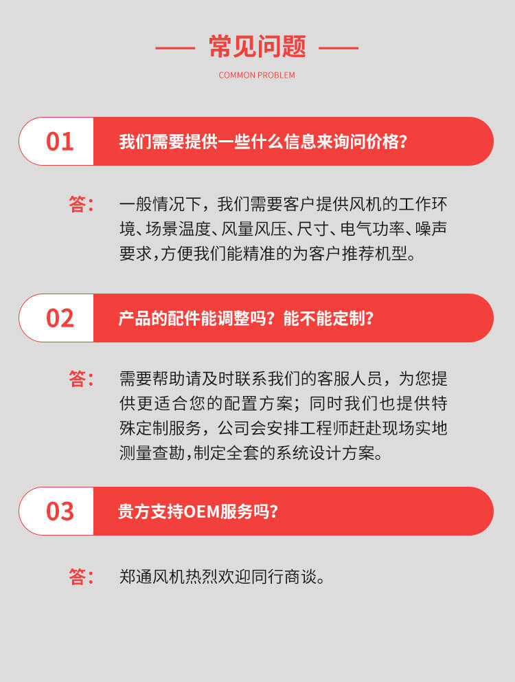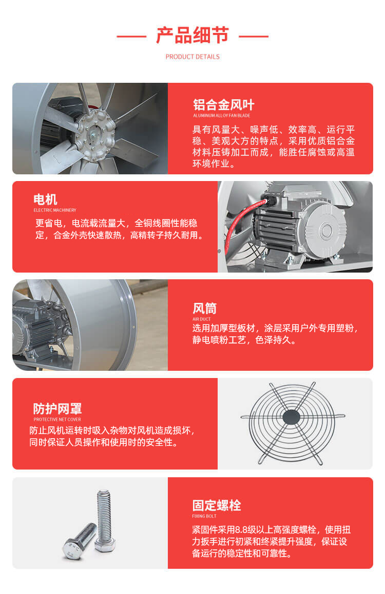 风机电机采用F级/H级绝缘,F级适合环境最高温度不超过90°C(H级不超过120"C),电动机轴承采用耐高温密封轴承轴承润滑油滴点温度≥230°C,防护等级IP56以上。可复位超然保护,电机运行寿命长,连续运转超过15000小时仍能正常使用。 风机风叶为CAD优化设计,可调节铝合金叶片,结构合理美观大方,采用优质铝合金材料压铸加工而成。风叶角度由流体力学专家专门设计,因此风量大、噪音小、效率高、运行稳定。 风机采用户外专用塑粉,静电喷粉工艺,色泽持久。